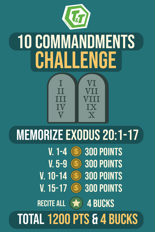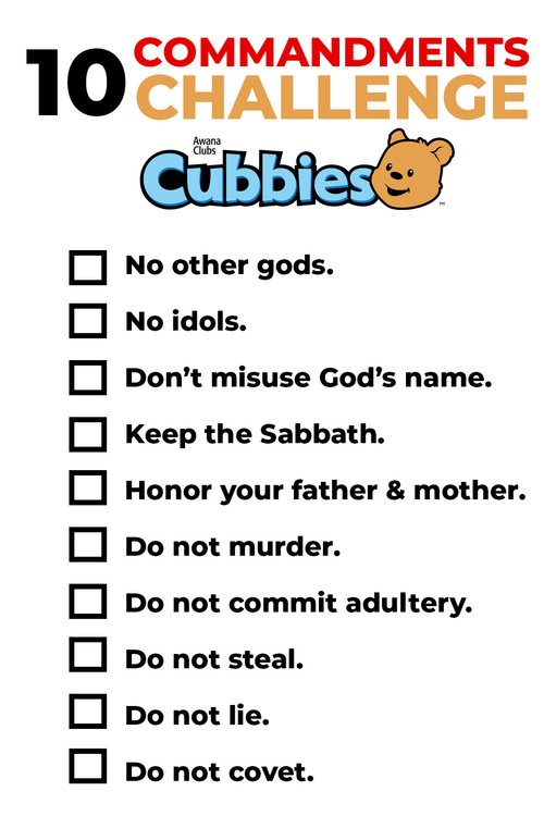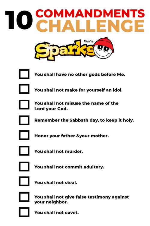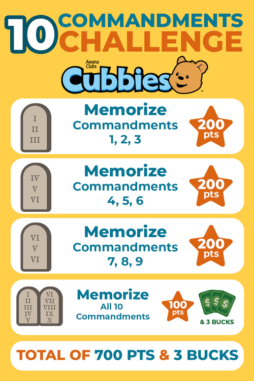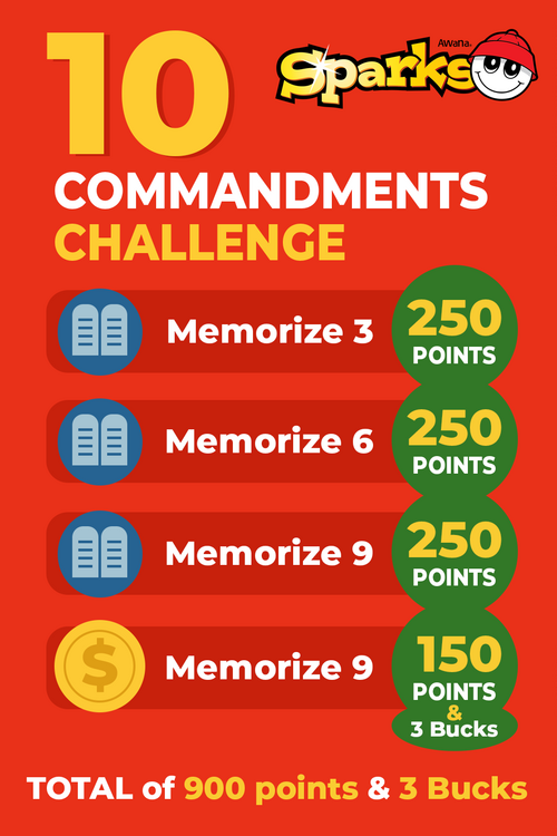 Throughout the semester, we are challenging each age group will to learn the Ten Commandments at their level—Cubbies with a simple kid version, Sparks with short phrases in order, and T&T with the full passage from Exodus 20. Along the way, can earn extra points and Awana bucks for completing their challenge.